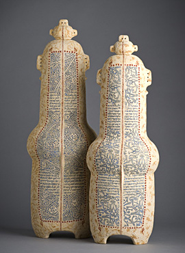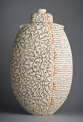 Sheffer’s work resonates with deeply held personal and philosophical convictions, “I perceive material and spirit as inseparable. I am a secular Jew; I belong to the people, the history, tradition and the gene pool but I am not religious as such,” she explains. “Humanity of all persuasions, even the most agnostic, harbours a deep need for ritual and custom, for the embodiment of the spiritual... in objects of meaning and beauty; I am interested in the manifestations of that need and in the conflicts it engenders...my inquiry naturally takes me on the path of the language I love and the stories of my ancestry, yet I am acutely aware of it being the story of humanity.” It was through this most primaeval material that Sheffer found an outlet compatible with the vehemence of her creative yearning. “I came to ceramics by chance; I fell in love with clay and hardly had a choice in the matter. Standing in front of clay vessels in the National Israel Museum, the course of my life had changed. I needed to make clay containers, ones that hold stories, hidden memories, and secrets...,” she stresses. “It was to become a way to reconcile my ‘split’ world... It provided me with a tool that is simultaneously a binocular and a magnifying glass.”