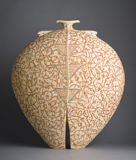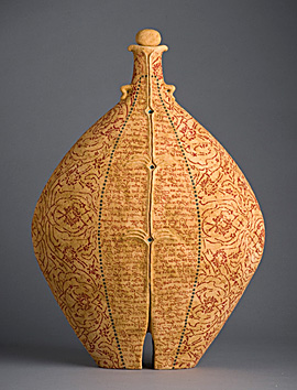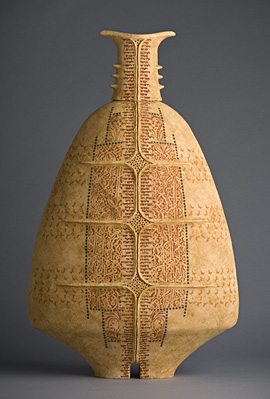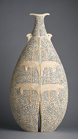 Sheffer’s imposing urns, vases, pitchers and jars give the impression of having been unearthed from some previously undiscovered ancient resting place. It is an aesthetic deeply rooted in the centuries old cultural traditions of the Middle East but also embraces the architectonic in the way crumbling edifices, domes and dwellings are referenced. The subtle, tonal hues of the pigments and decoration are combined with the texture and ‘weathered’ quality of the surfaces, to forge a seamless contemporary expression of a ‘timeless’ theme. There has always been a latent compulsion towards the archaeological in Sheffer’s outlook, “Since I can remember I had an almost irresistible urge to dig in the ground, to find things, the earth was packed with thousands of years of fragments of human existence left behind, my imagination would continue lines and curves and make up the lost form, inanimate objects would then become animated,” she recalls. “I come from a traditional background which holds [an] appreciation for accumulated culture, for creativity and intuition that spring from knowledge of the past...”