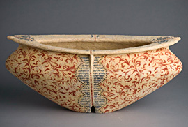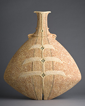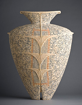 It is her utter absorption in the technical process and rigorous engagement with its artistic antecedents which prevents Sheffer’s work from being merely derivative, or drifting into the realm of faux historical. “I have been fully engaged in making since then, it has become the focus of my life and my full-time work, in which I am rather disciplined,” she maintains. “In the past five years I have been exhibiting back-to-back, with short periods of travel overseas for research and gathering of materials and periods of developing print work.” Sheffer begins by making plaster moulds in which she coils the bases of the vessels, then handbuilds the forms. Working in this way allows her to realise comparatively large shapes that spring from common beginnings and then assume their unique character. “They are like individuals within an extended family, or a tribe. When building the vessels I know where I start, with a familiar curve or line, but where they end up is always a mystery and a surprise. It is a bit like parenting children, where shared genealogy is expressed in peculiar and unpredictable personalities, a fine line between forming, shaping and accepting what comes, between knowledge and tentativeness,” she observes.