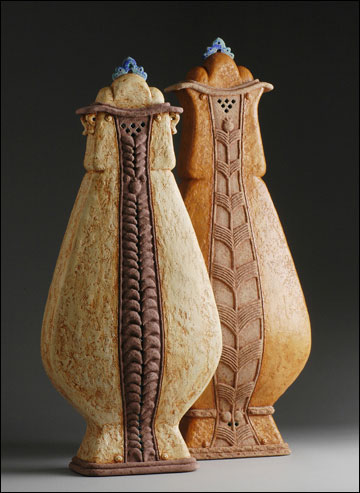 Nestled in the hills behind Mullumbimby in Northern NSW are two artists making vessels and sculpture that acknowledge and celebrate ancient traditions. The ceramics of Avital Sheffer and Margaurite Josephson connect viewers directly to ancient and Middle Eastern culture through references to architecture, text, sacred symbols and calligraphy. By using surface techniques they have developed, they have created forms that have archaeological resonance: new works with an ancient feel.