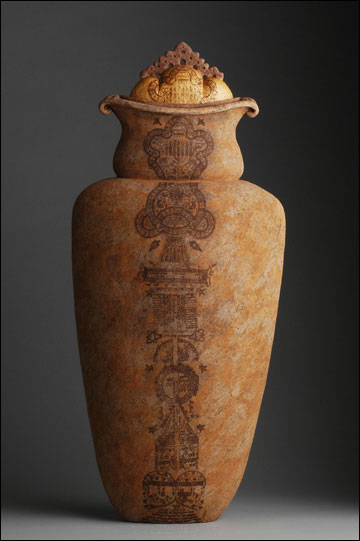 Tradition is used by Sheffer as a departure point for her work. The spice bottle form is a graceful vertical, usually capped by at least one but sometimes a trio of domes. Their shape is also architectural and some even hold the essential proportion of a human figure. Clusters of holes punctuate the forms to allow for the passage of air and light. While the forms of Shaffer's spice bottles reflect traditional shape and function there is also something speculative and new about her work. Aspects of ancient texts and symbols have been screen printed on the ceramic surfaces. The decoration of the bottles creates an intricate, busy graphic style. The symbols come from a range of ancient Middle Eastern cultures and their combination creates a surprising harmony of marks.