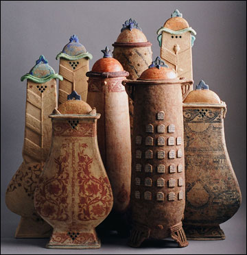 Given her previous experience, it is not surprising that much of Sheffer’s work is architectonic. Some aspects of her ceramics reflect parts of the landscape, the buildings, the walls and the timelessness of the centuries. Her surfaces have the dry pitted look of ancient buildings with their crumbling walls and powerful suggestion of a culture very different from the Australian one. They are not smooth; her glazes are dry looking with totally matte finishes except for the smaller pieces for which she uses terra sigillata. Her architectural experience is evident in her overall ceramic design, with many of the pieces suggesting some earlier Eastern form of habitation. Many of the works could be described as non-functional lidded jars; the lids, however, Sheffer describes as ‘domes’, and when seen in groups, the clustered domes take on the mystical quality of a Middle Eastern village as if seen from afar. This is apparent in Group of Vessels III. Domes are n integral part of the old Middle Eastern landscape, and may symbolise many things including shelter, places of worship or hiding, and also some form of dominance and suppression, She makes her domes from terra sigillata which gives them a smooth sheen, in contrast to the bodies of these works.