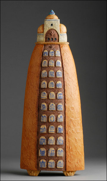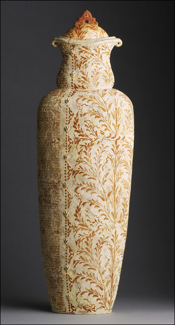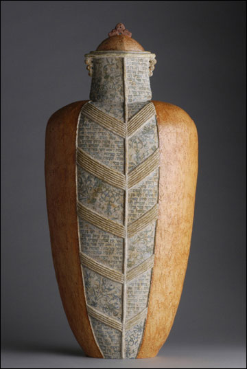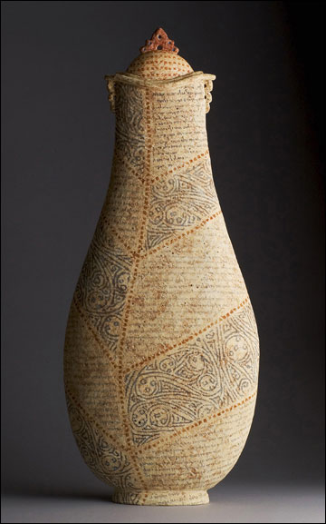 Mistor meaning hiding place, combines prints with stylised cabalistic texts, and the pot’s form suggests that it could be the hiding place for ancient texts and scrolls, and by extension, becomes a hiding place for knowledge and all that implies. When knowledge is withheld, people remain in ignorance of that knowledge. The Onomasticon series tells of the Book of Places, the places where major events have occurred as well as the small quiet places, where over the centuries, history has been written and re-written many times. The Book of Places anchors those events very firmly in specific lands and places. It becomes quickly evident that although Sheffer is Jewish, she is also proudly and consciously Middle Eastern, and has spent her life ideologically aligned with the Peace Movement, and through her philosophy of combining the Israeli and the Islamic cultures, she can at least create peace on the surface of her ceramics. The political statement is there. Her love and understanding of the Middle East is a most important aspect of this artist’s psyche.