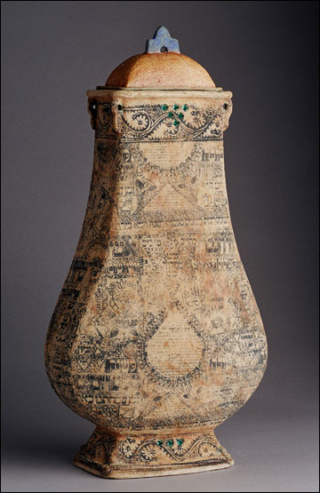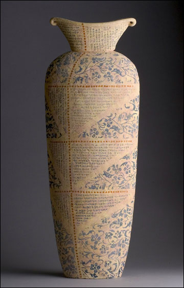 Many of Sheffer's works celebrate Middle Eastern design elements and traditions. In older civilisations, clay jars and pots were used for storing all manner of things, not only food, wine and water but also valuable and precious things, such as documents, religious scrolls and important family possessions. Much of her work is redolent of these things. This also applies to her decoration, which combines both Jewish and Islamic folk art and motifs taken from ancient artefacts. The Hebrew word Shefah (meaning abundance) is inscribed on one side of a pot, parts of the Book of Wisdom stripped of politics and organisational structure, while on the other side of the pot is an ancient Islamic folk design, showing that the two cultures, which have so much in common, really can live happily and harmoniously together. Staf Em (meaning mother tongue) combines on one side, words from an actual marriage certificate written in Hebrew, and designs from ancient Jewish amulets, combined with old Islamic designs on the other. Amulets were ancient charms, worn to ward off evil, and were highly decorative and beautiful. In past centuries, many of the things both used and worn in peoples’ daily lives were decorated with traditional patterns and designs. Even the most mundane objects were celebrated in this way. Art was found everywhere in the old traditional life-style. Sheffer says that in terms of art in our daily lives, that is life in the 20th and 21st centuries, our philosophy of art functions in a different way. We tend to hang it on our walls and we see it in exhibitions. We separate it from, rather than integrate it into, our daily lives. ‘One of the injustices of embracing modernity has been that we have thrown the baby out with the bath water.’